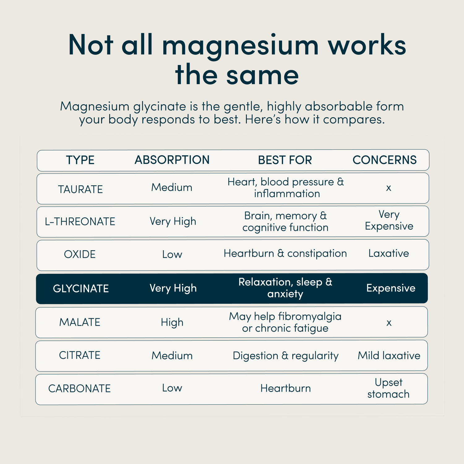 "Magnesium Glycinate has been shown to be highly effective in easing the transition to sleep, significantly shortening the time it takes to fall asleep, and promoting much deeper sleep."