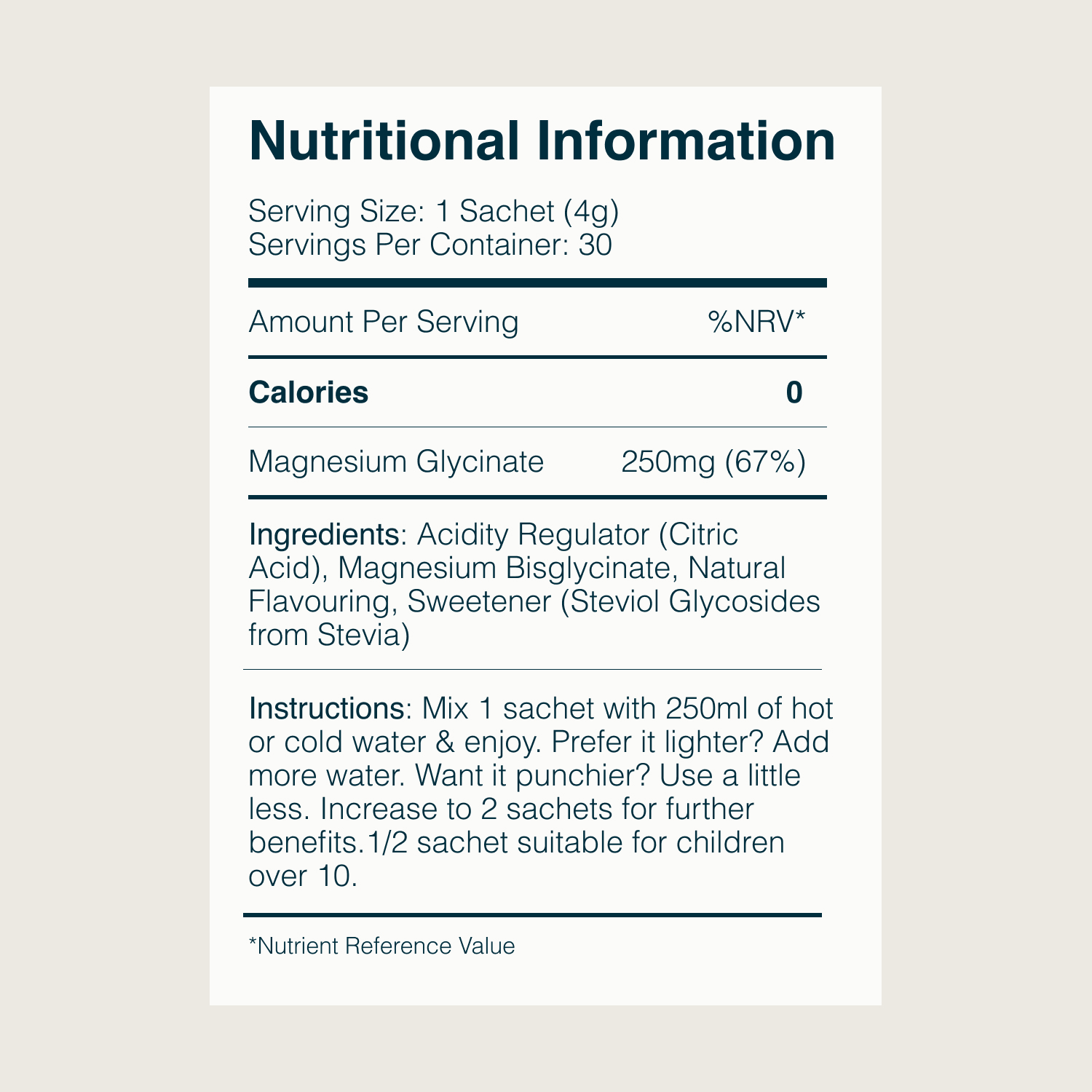 Formula: 250mg elemental magnesium from magnesium glycinate, citric acid, natural flavouring, stevia leaf extract.